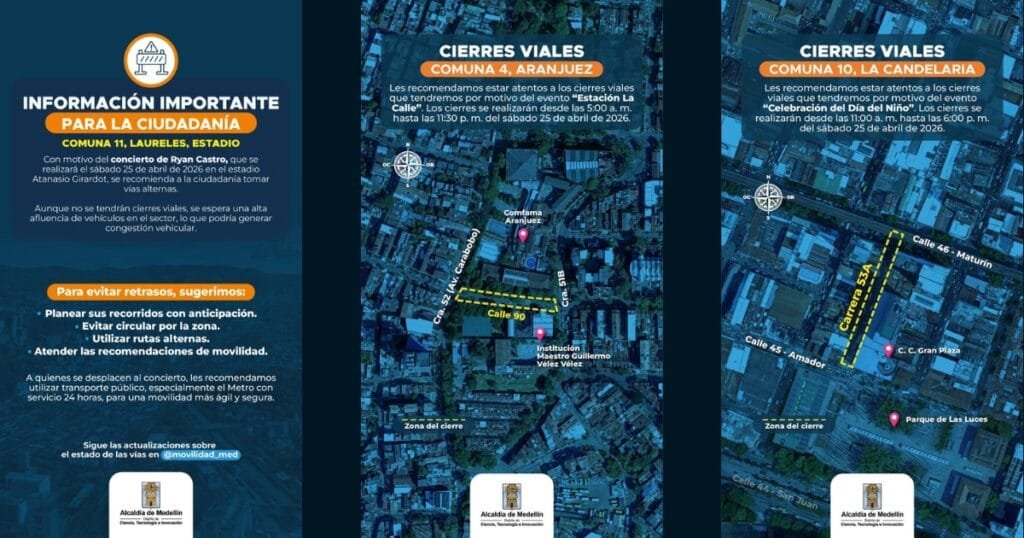La Alcaldía de Medellín, a través de la Secretaría de Movilidad, implementará cierres viales temporales este sábado 25 de abril, para facilitar el tránsito y garantizar la seguridad durante el desarrollo de varios eventos de ciudad.